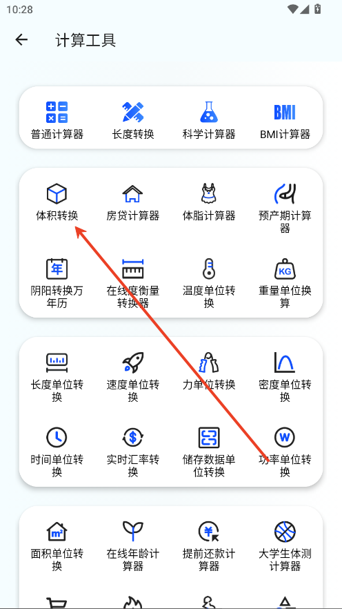 当你点击进入"计算工具"部分时,会展示出各种类型的计算器,包括常用的数学计算、单位换算、日常生活中的常见计算需求等。用户可以根据具体的需要,选择不同的计算器,使用起来非常方便快捷。