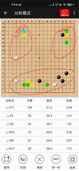 人机对弈:包含AI闯关、巅峰挑战(网络AI,包括星阵、LeelaZero和KataGo)、9路本地AI(KataGo CPU引擎)、13路本地AI(KataGo CPU引擎)、19路本地AI(KataGo CPU引擎)、KataGo分析模式。