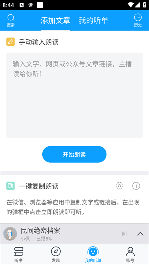 产品外任意网页链接,随时随地任意听,网易、知乎、今日头条、UC浏览器等文章也可一键朗读!