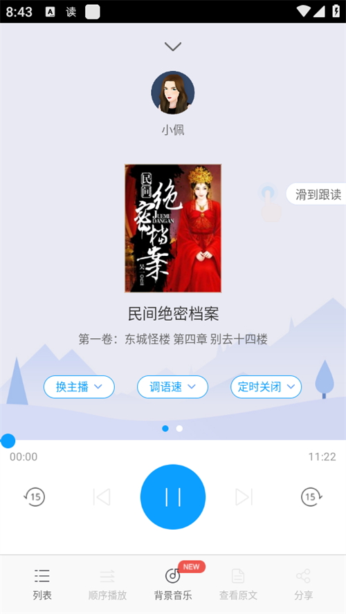提供多款高音质流畅朗读主播,磁性男声、婉转女声、方言普通话、中英双语混读应有尽有,带给您真实美好的听书体验。