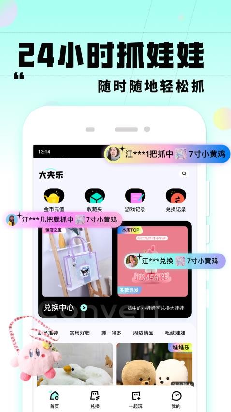 大夹乐是非常有意思的线上抓娃娃平台,里面的娃娃机有超多可爱的毛绒玩具任君挑选,还有很多不一样的玩法,让用户足不出户在家就能体验抓娃娃的快乐,并且抓到娃娃后,平台会将娃娃包邮送到家。