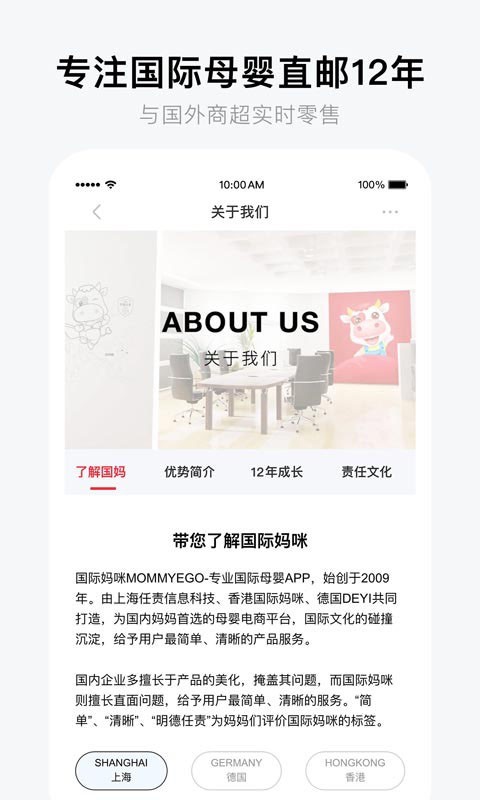 答:国际妈咪成立于2009年,由香港国际妈咪易购有限公司INTERNATIONAL MOMMY EGO LIMITED与德国Deyi Internationnal Logistics & Trade GmbH共同成立,大陆技术与服务由上海启昂商贸有限公司与重庆霍夫曼国际贸易有限公司负责,国际妈咪秉承“海外直邮,与世界宝宝同步”为核心理念,提供的所有商品均为海外本土商品,与发达国家的宝宝用品同步(并非针对大陆的进口版商品),以海外直邮的高诚信方式赢得了妈妈们的欢迎,国际妈咪为国内少数拥有自己独立海外实体公司与仓储的企业。
