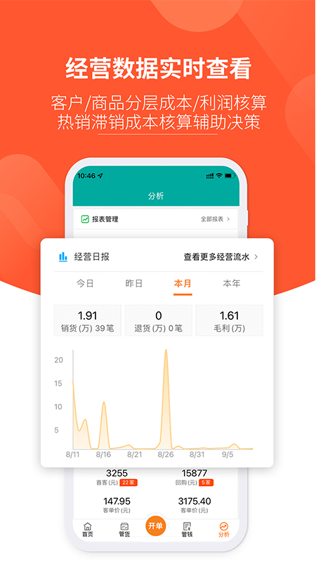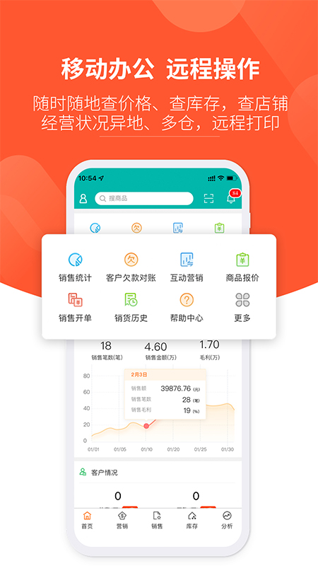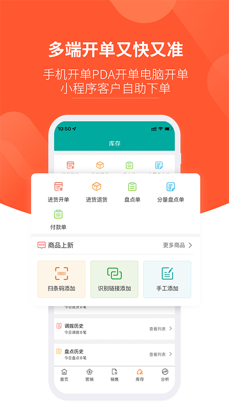 一部手机即可随时随地管库存、管销售、管客户,支持手机开单、批量收款、手机查库存查价格、远程开单发货等。开启线上卖货新通路,统一管理线上线下多渠道,智慧做生意