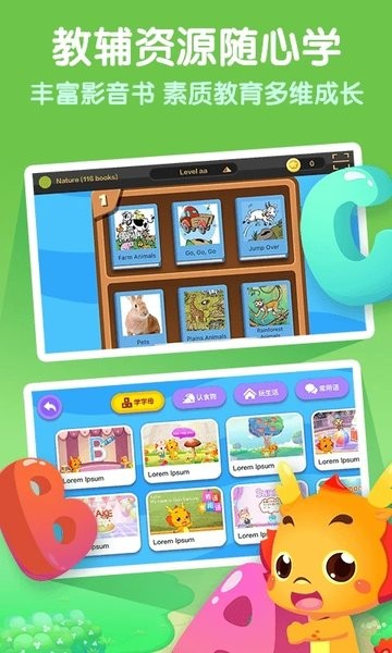 小伴龙ABC英语——为儿童启蒙打造英语分龄学习平台,对标幼儿阶段英语内容进行英语学习,为孩子提供丰富教辅资源,培养孩子学习英语的兴趣,助力孩子爱上英语。