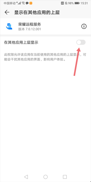 2.因为应用需要在其它应用界面上面运行,所以用户开启下图红色箭头所示权限即可正常使用