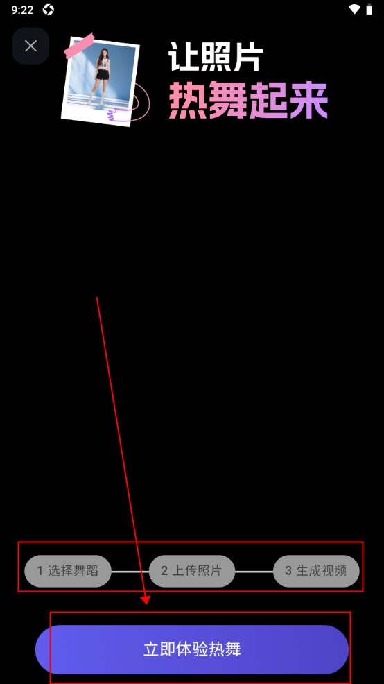 后续app就会自动弹出ai页面,这时候根据步骤提示点击立即体验热舞。