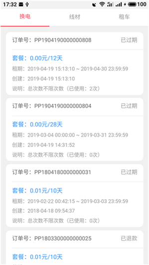 2、切换到【订单】页面之后,我们还能看到自己所有的换电、线材、租车订单。