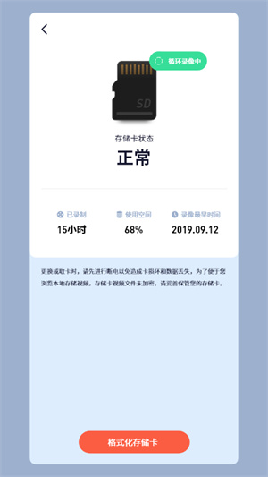 ICam365监控APP还可以在这里查看摄像头里面的存储情况,已录制时间、使用空间、录像最早的时间等等,支持一键清空存储卡,让用户时刻记录每天的录像情况。