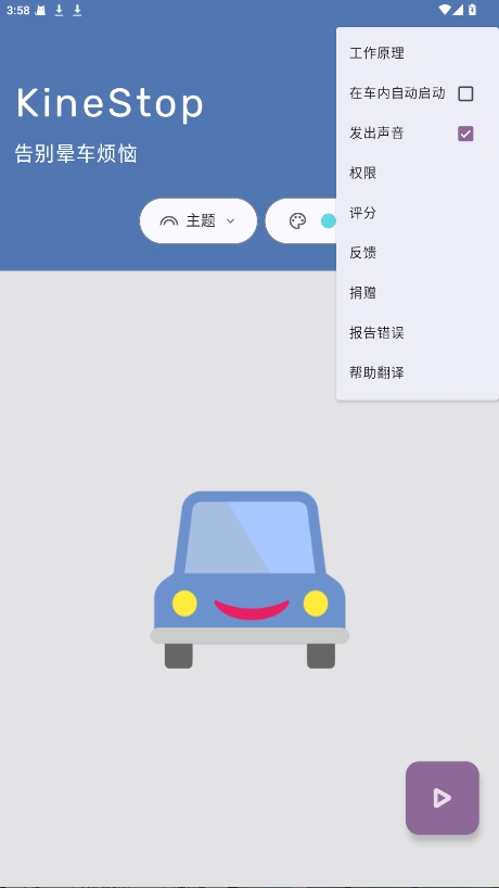 KineStop 是一款专为防止晕车设计的智能辅助应用,通过视觉引导与动态稳定技术,缓解乘车过程中的不适感。用户可开启专属防晕模式,调节屏幕视觉辅助效果,减轻眩晕、恶心等症状,尤其适合长途旅行或易晕车人群使用。界面简洁易操作,让出行更轻松舒适。