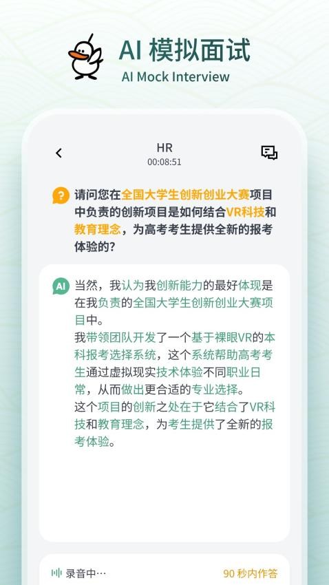 3、进行AI模拟面试,可通过录音的方式回答面试题,并能知道回答效果;