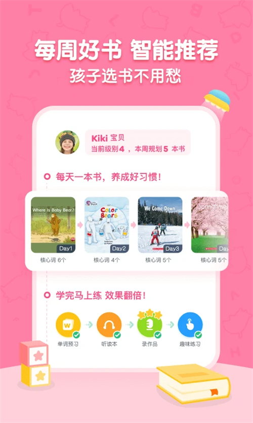 6、软件会以【词汇预热、听读本、录作品、趣味挑战、阅读理解等方式教你】