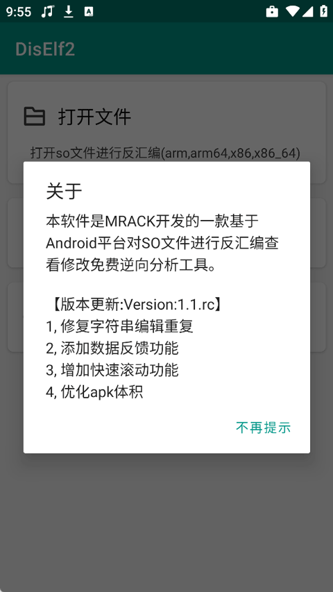 DisElf2 是一款免费的手机版SO文件反编译工具,专为安卓开发者和搞机爱好者设计。它无需root权限,无需额外安装脱壳工具,支持一键去除360加固,能精准解析SO文件,并将机器码反汇编为汇编语言。支持多种处理器架构,包括arm、arm64、x86等。内置高级扩展功能,如伪C转换,能够帮助用户快速修改文件中的关键方法与代码片段,完成APK解包、SO修改及重打包等操作,适合用于应用漏洞挖掘、底层原理学习等任务。
