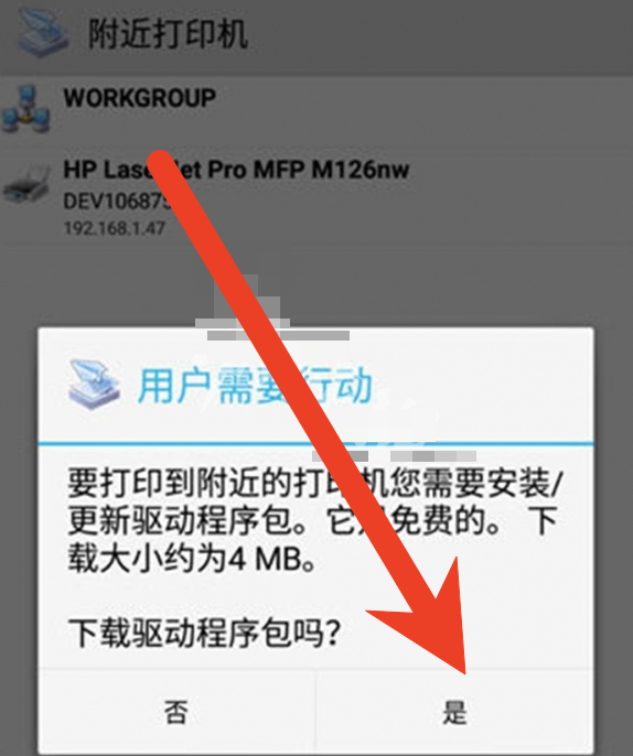 2、在附近打印机中找到设备后,点击设备会提示要安装驱动包,一定要下载安装,否则无法打印。
