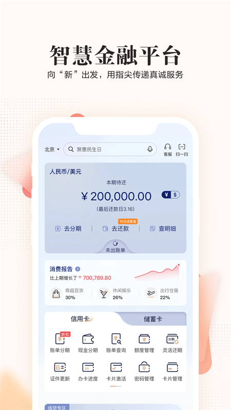 在线办卡:您可通过民生信用卡全民生活APP在线提交申请,海量产品,最快3秒核卡。