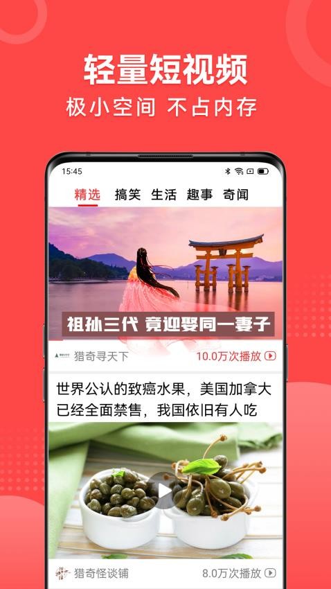 视频看天下最新版是一款覆盖多领域视频内容的软件,在软件中将视频分为了搞笑、生活、趣事、奇闻等多个领域类型,用户可以随时在线观看各种视频内容,将各种精选视频进行精选推荐,用户可以在精选推荐专区来轻松查找到各种精彩视频内容查看,支持用户观看本地视频,将本地视频一键播放来随时观看使用,将视频文案的字体大小自由调整,可以调整到超大字号来让老年人也能轻松查看其中的文字内容,高清视频可以提升用户对各种视频的观看体验,观看搞笑类视频还能收获开心日常减压使用,有需要的用户就快来下载视频看天下免费版软件进行使用吧!