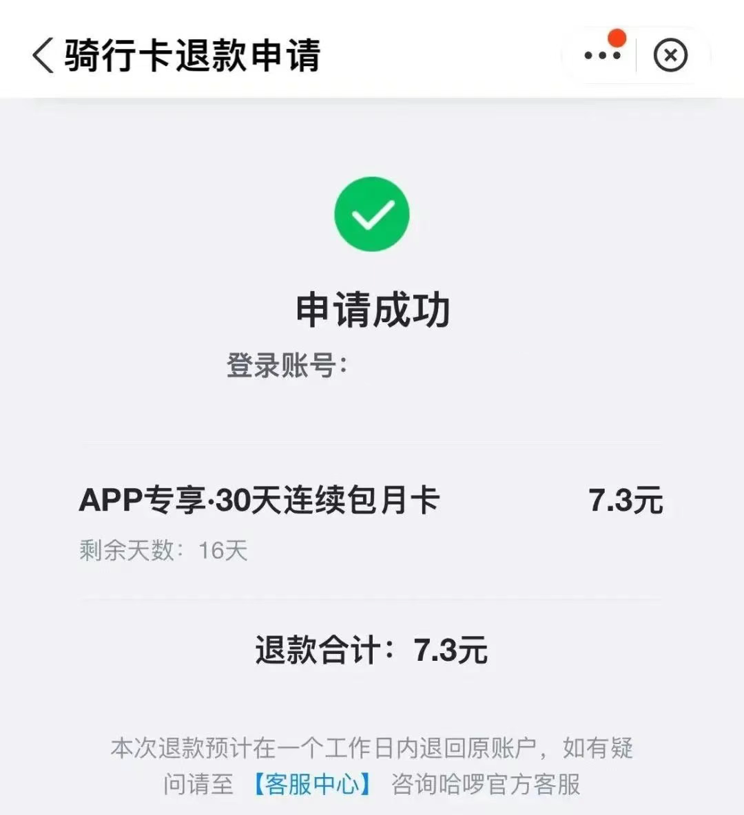 ●通过哈鲂APP申请退款:打开哈鲂APP,进入“我的”页面,找到“客服中心”或“联系客服”选项。在客服界面中,选择“骑行费申诉”或“退卡服务”等选项,然后按照提示操作即可。