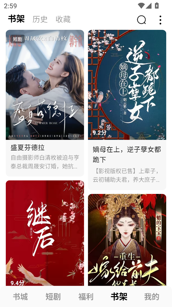 3.进入书架查看自己添加的书籍,删除已完结的书籍,点击书籍继续阅读。