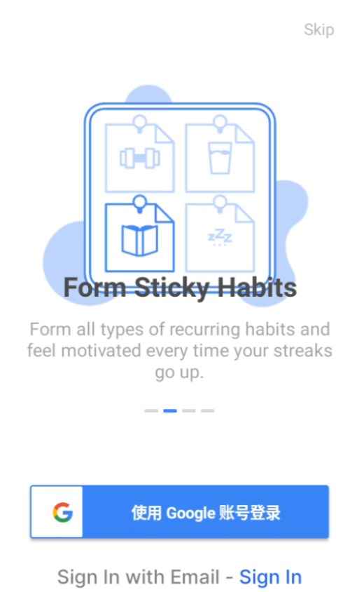 习惯也可以按照话题(健康/工作/家庭……)或时段(早上、下午、晚上)分组。使用者可以在日志中追踪养成好习惯或戒除坏习惯的过程