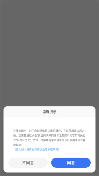 1.下载正大超人app最新版本,看到如下的温馨提示直接点同意。