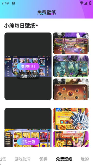 6.点击“免费壁纸”标签,进入壁纸专区,可浏览每日推荐的热门游戏壁纸,如《秦时明月》《龙珠觉醒》等,点击即可下载使用。