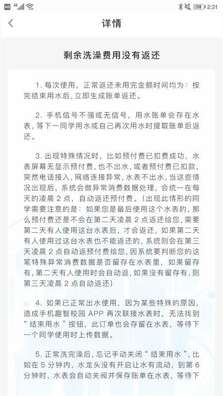 答:请使用完后手动点“结束用水”,否则预扣款会留在水表。没返还,需手动连接一次该水表,或等下一个用户使用该水表,将预扣款结账后的钱返回上一个用户。遇异常没返还的消费,次日系统会自动返还。如返还失败,请联系管理员。