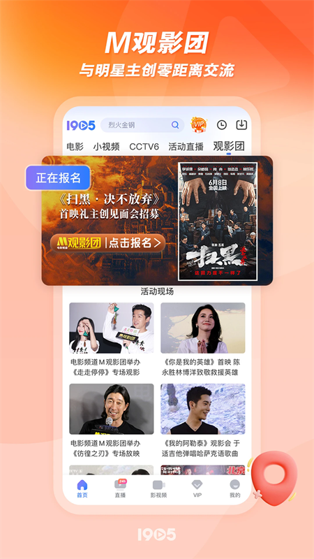 1905中国电影网app同时还与电影频道同步直播,用户可以在这里看到一天24小时不间断的佳片联播。更值得一提的是软件还有各种电影主创见面会以及院线大片点映、首映礼,用户可以在这里与自己喜欢的明星主创们来上一场零距离交流。