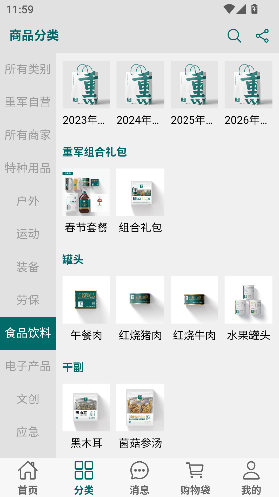 3.点击主界面分类入口,可见军车自营及特种用品等商品分类列表。