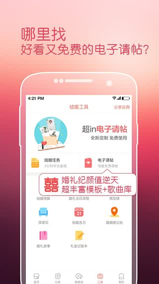 最实用:免费提供8大结婚工具,想邀请亲朋好友就用电子请帖,想知道备婚流程就用结婚任务,想了解黄道吉日就用结婚吉日,更多工具等你来体验。