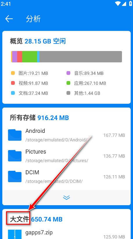 7.显示有大文件、所有存储、最近文件、重复文件等等板块内容,比如小编以点击大文件为例。