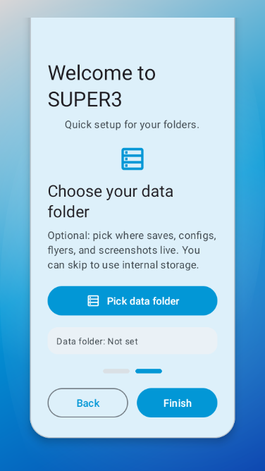 3.返回设置界面,系统提示可选择数据存储文件夹,用于保存存档、配置、截图等信息。用户可点击“Pick data folder”自定义路径,或直接点击“Finish”跳过并使用默认内部存储。