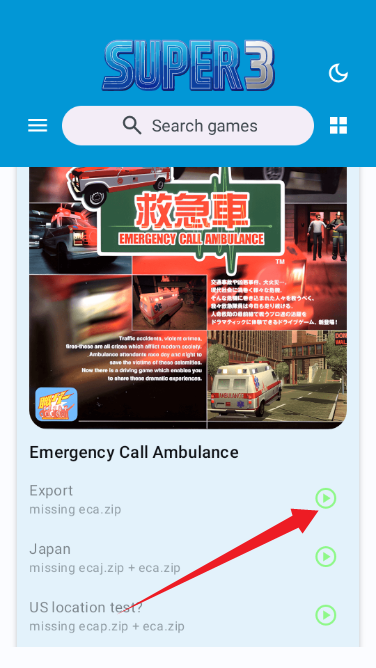 8.在游戏列表中,点击任意游戏(如《Emergency Call Ambulance》)可查看其不同版本(Export、Japan等)及缺失文件提示,点击绿色播放按钮尝试运行。