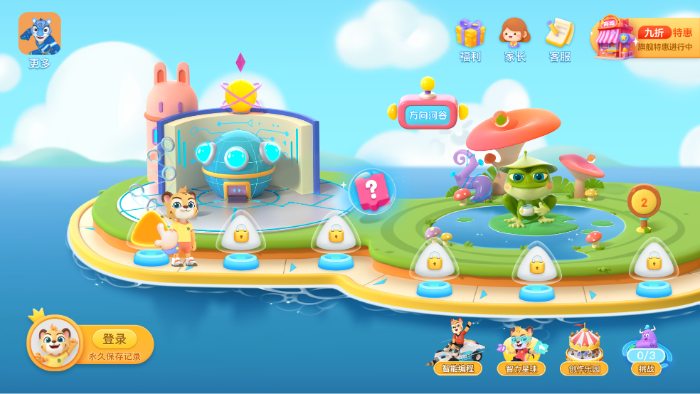 1.3D趣味闯关编程,编程创作融入闯关互动,通过3D趣味闯关结合创作的双循环模式。