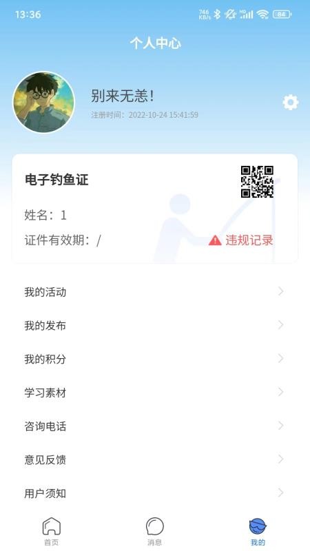 展示了用户详细的个人中心,可以对自己电子钓鱼证来进行查看,掌握证件有效期。