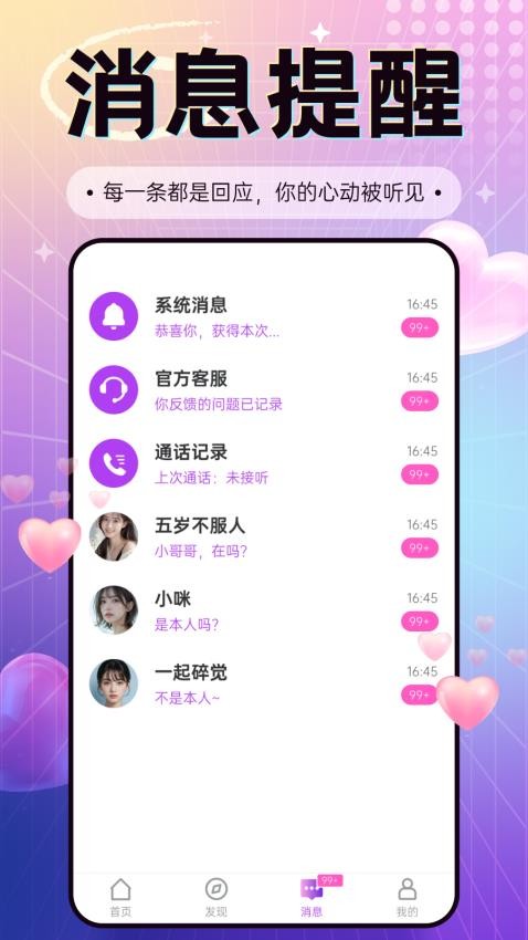 系统消息、官方客服、通话邀请以及私聊互动等消息都能及时提醒,便于查看和互动;