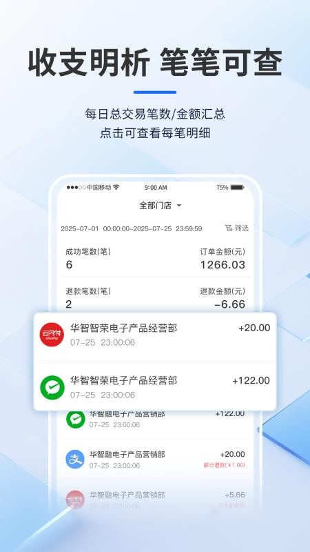 5、查看收支明细,知道每笔收款数据,了解支付类型,便于对账;
