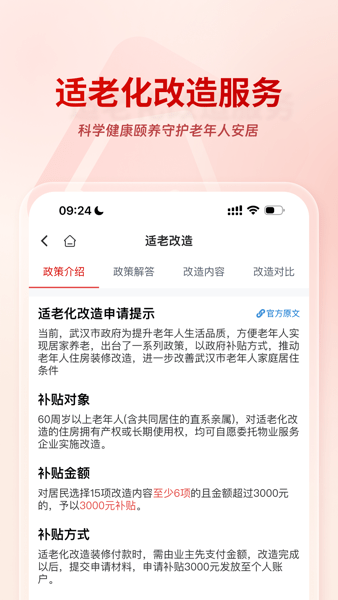 5. 适老化改造服务:为老年人提供科学健康颐养服务,省时省心,享受官方补贴,并提供适老化改造服务。