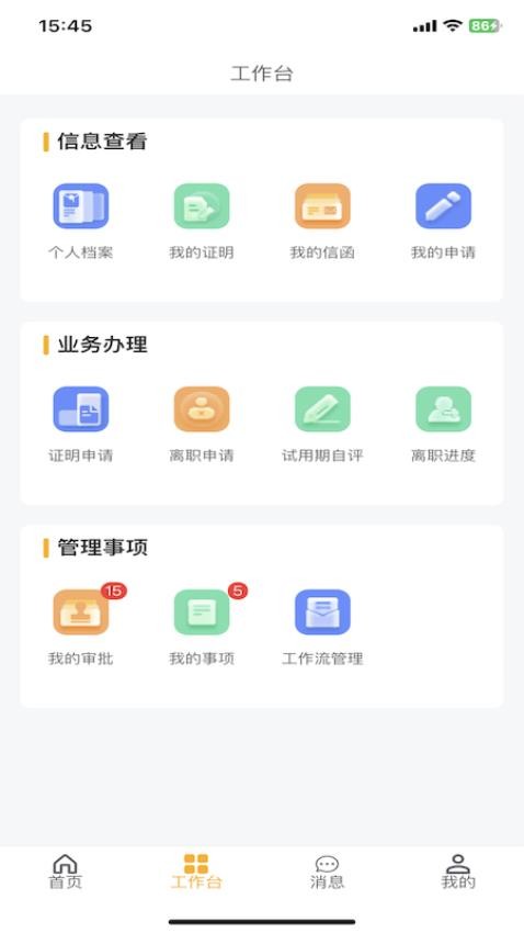 2、在工作台可以全面了解办公功能,并能在线查看个人档案、证明、信函和申请等信息;