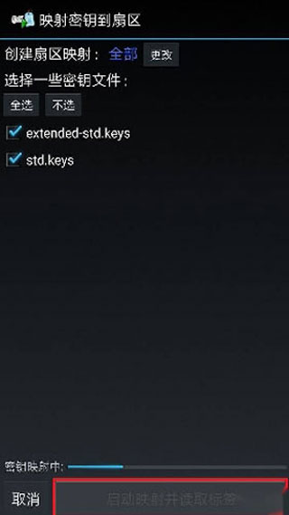 2、在MCT主界面点击“读标签”->勾选密钥文件(包含了常用的密钥)->把原卡置于手机NFC感应区,点击“启动映射并读取标签”