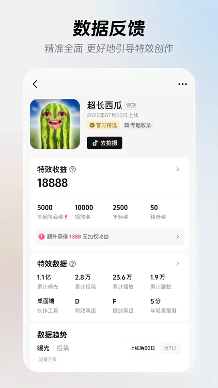 像塑app专业版同时还为用户准备了丰厚的创作者激励,用户可以在软件中享受抖音的百万级推广资源,还可以获得抖音原创设计师认证,轻轻松松就能打造爆款特效。此外,该软件还能够为用户提供详细的数据,可以帮助用户更好的进行后续的特效制作。