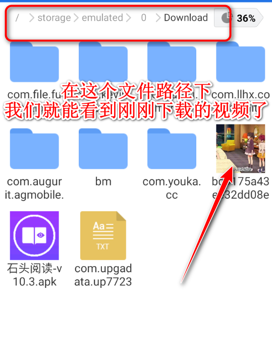 我们上一个方式是用下载的方式查看,这里我么能用文件浏览器路径的方式给使用者展示视频位置:storage/emulated/0/Download。在这里你就可以看到下载的视频了。