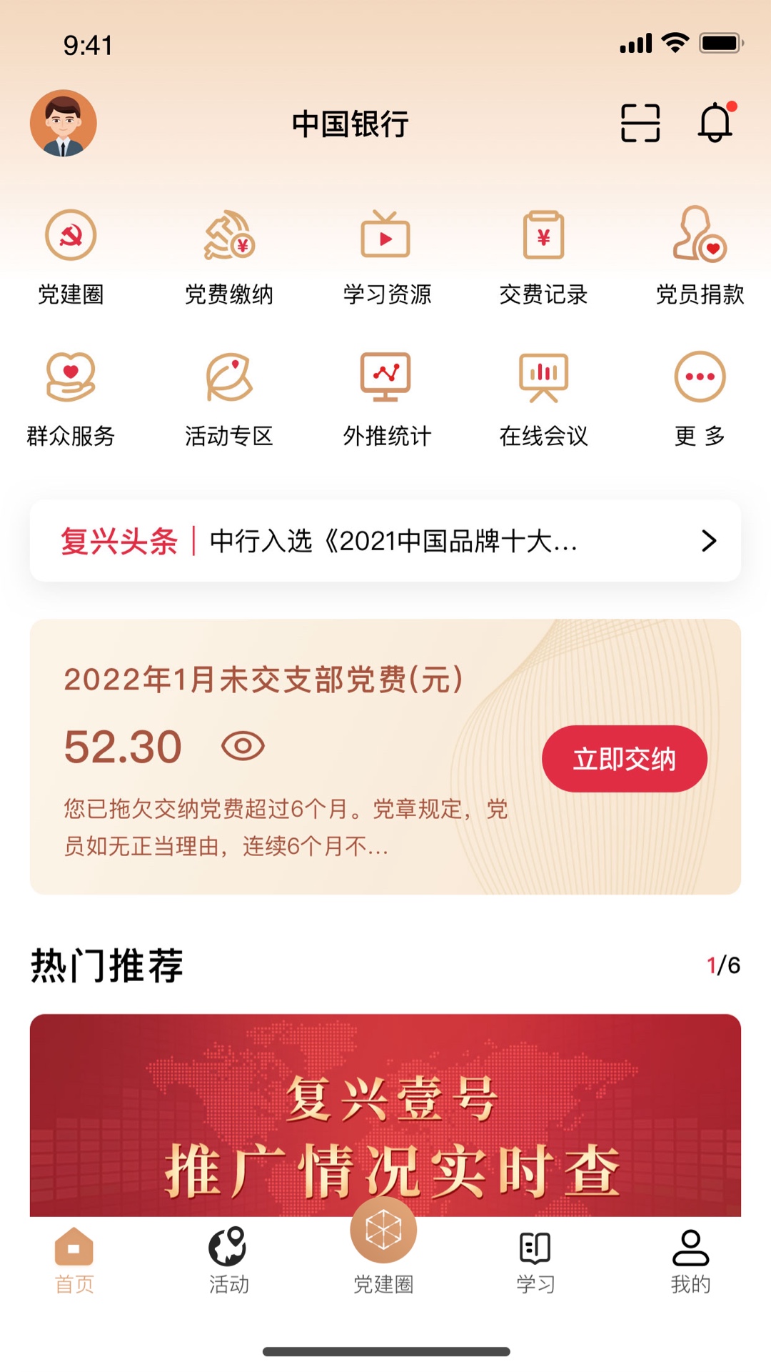旗帜复兴壹号交党费2023最新版是一款为大家提供一站式综合党建服务平台,大家可以在线缴纳党费,快捷方便。提供海量资源给各位党员学习,丰富知识提供思想觉悟,这里还会不定时开展党员活动,线上线下和各位党员交流互动。有需要的伙伴欢迎下载使用!