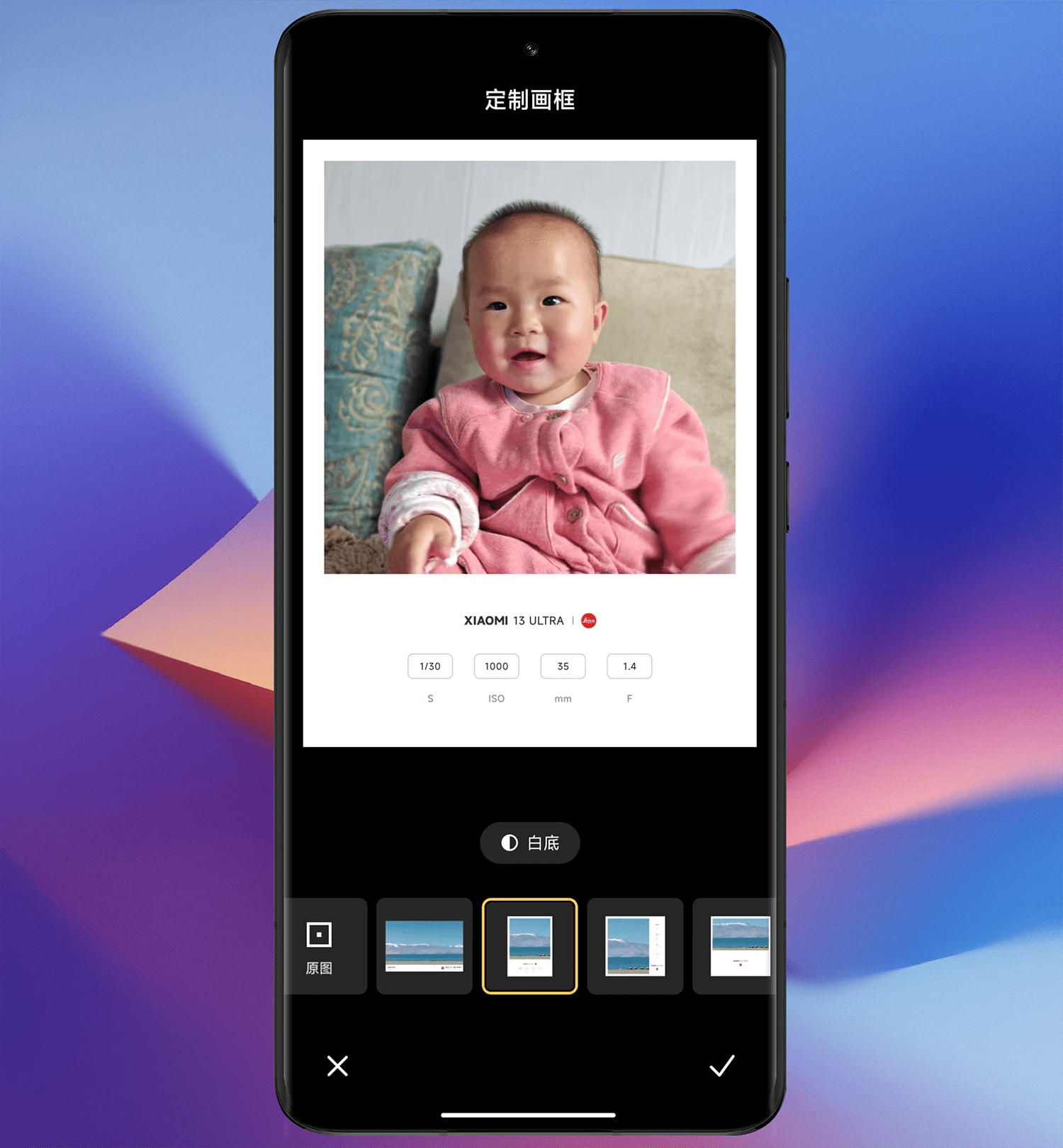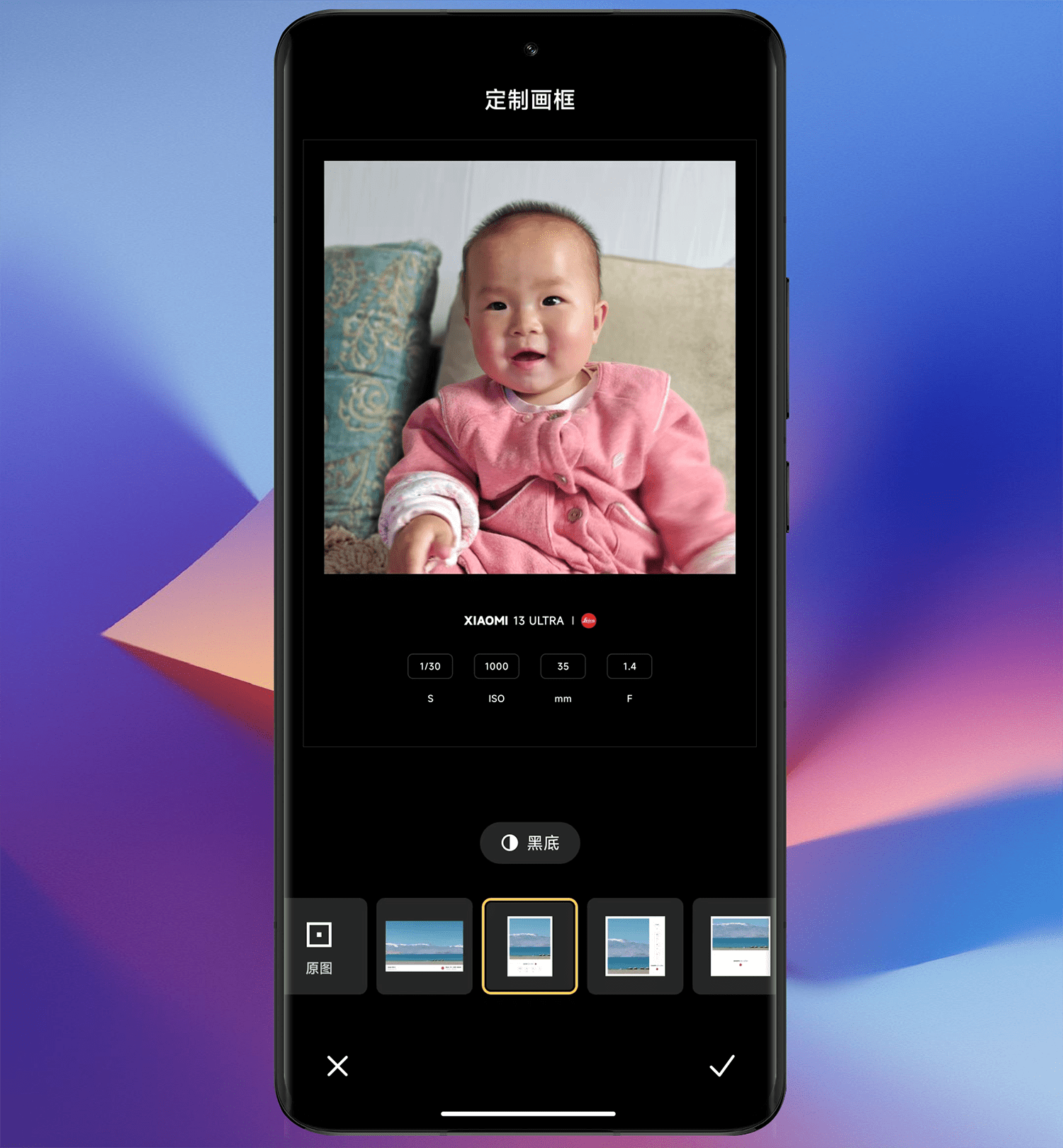 相机设置的徕卡定制水印是自动添加的,而针对“萌拍”模式下的照片不自动添加水印,我们则可以通过定制画框功能实现添加水印,并且小米13 Ultra提供了10款定制画框,支持黑、白底色自由切换。