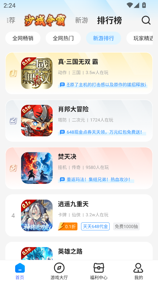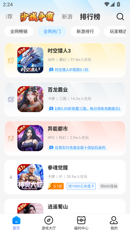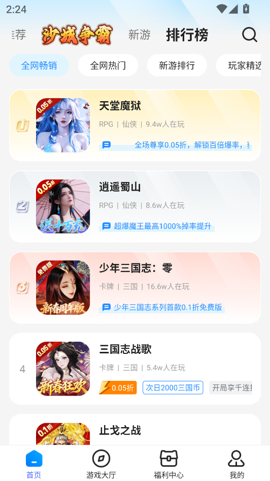 2、在游戏大厅界面下,我们可以根据0.1折、仙侠、卡牌等一系列条件筛选自己喜欢的游戏。