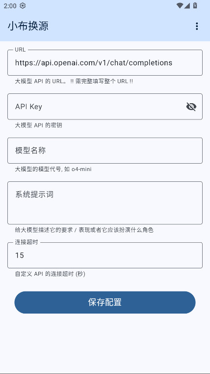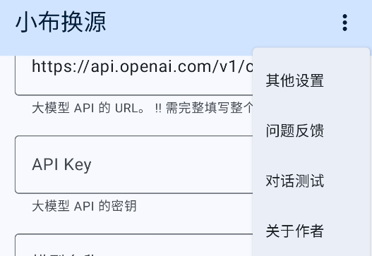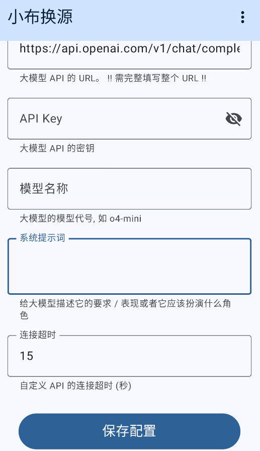 6、打开小布换源APP,填入你获取到的第三方大模型API地址和密钥后点击保存配置