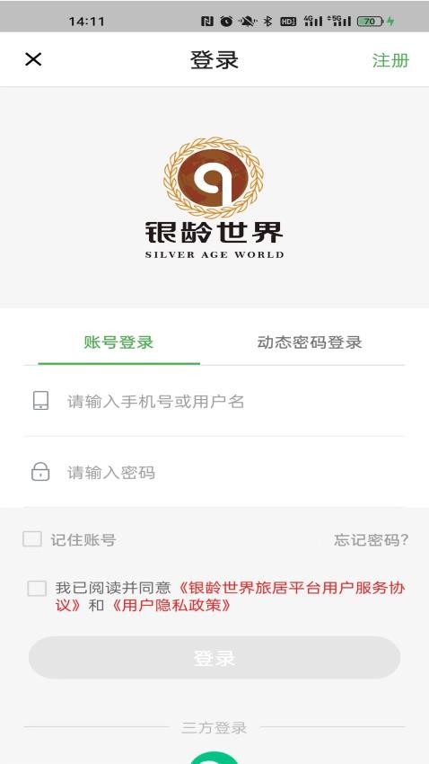 1、下载并打开银龄世界养老APP,即可使用手机号或微信登录