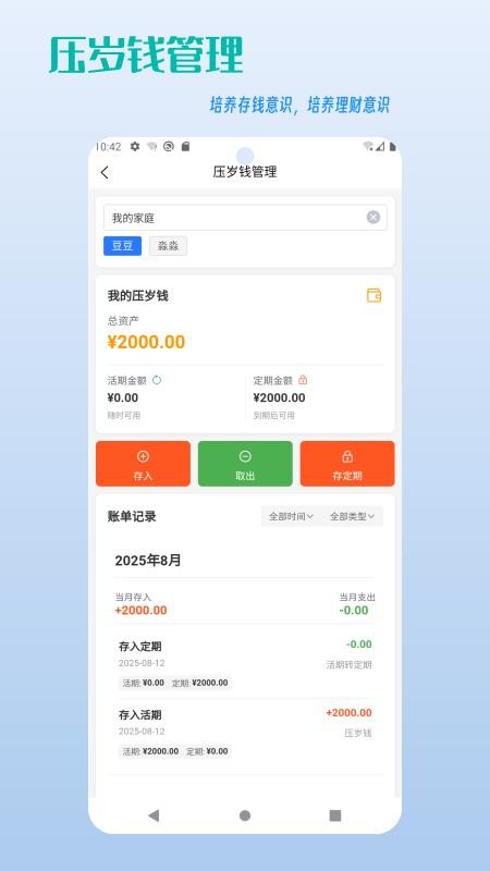 为用户提供了压岁钱的管理,从而可以对孩子的压岁钱来一键管理,培养孩子的存钱和理财意识。