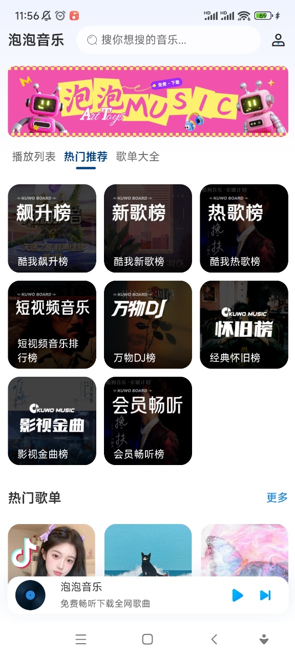 泡泡音乐app官方正版安装版是一款专门为所有音乐爱好者而准备的手机听歌软件,这款软件不仅提供了流行、摇滚、电子、古典等多种类型的音乐资源。而且我们还可以通过这款软件来使用排行榜、热门推荐、搜索等多种功能,从而让你获取到自己需要的音乐。当然,你也可以通过这款APP来直接下载音乐,从而保存到自己的手机里。
