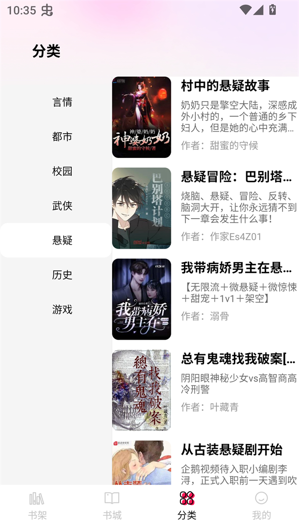 2、接下来我们可以点击书城功能来获取到言情、都市、校园、武侠、悬疑等多种类型的小说。