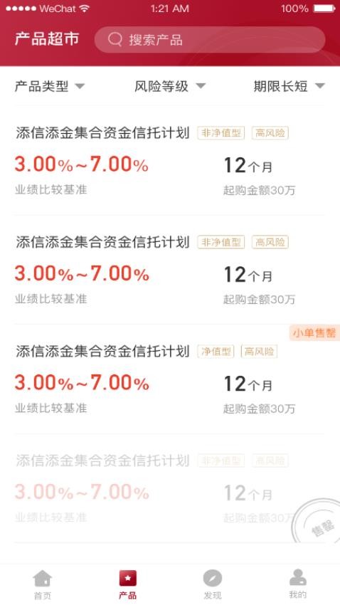 支持通过产品类型、风险等级、期限长短等方式查找产品;