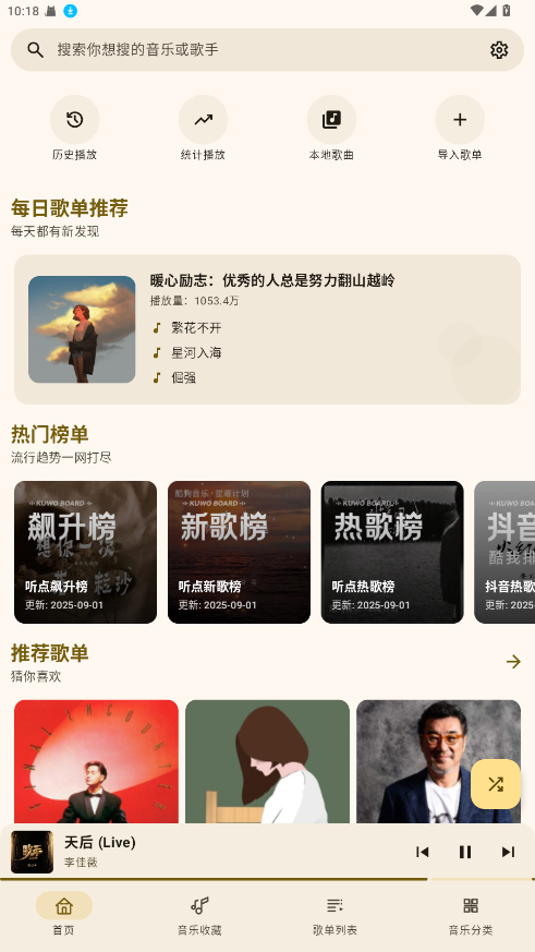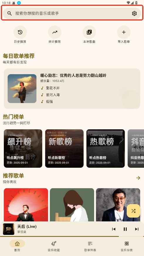 1.进入首页即可浏览热门歌曲、歌单和推荐榜单。